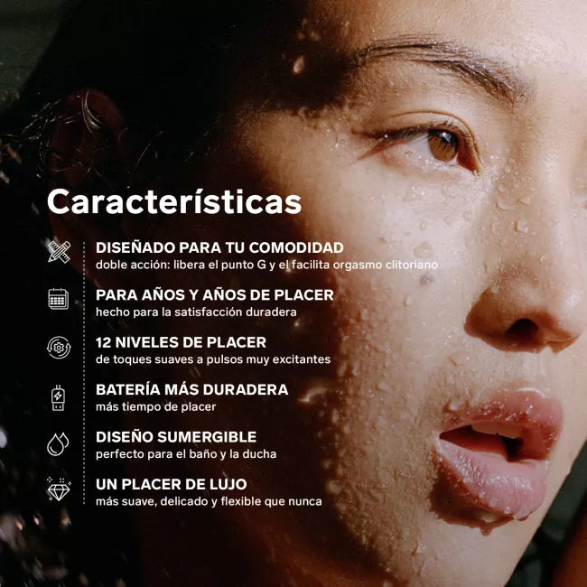 - Experimente la máxima satisfacción: 2 puntos de placer para un masaje combinado interno y externo.