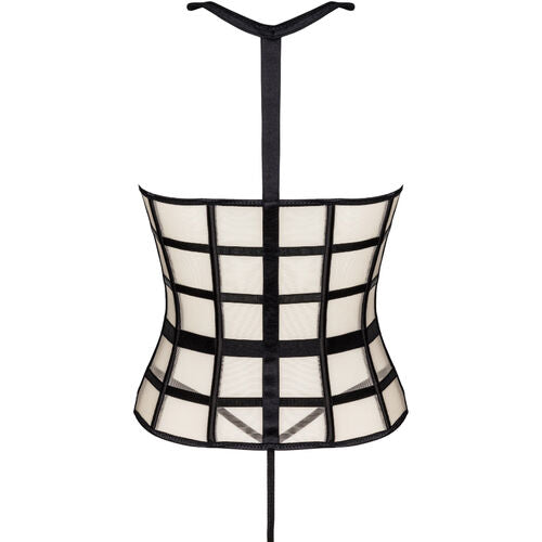 Un conjunto de dos piezas compuesto por un sensual corsé con el pecho al descubierto y un sexy tanga negro. El corsé tiene una cremallera en la parte delantera, lo que facilita su colocación. Los colores del conjunto son el negro y el beige, que juntos crean una atractiva combinación. También vale la pena prestar atención a detalles tentadores como un cuello negro o cinturones negros dispuestos de tal manera que realcen mejor la cintura. Lo que más destaca de este corsé son los recortes que exponen el busto. Esto hace que todo el conjunto sea muy atrevido y provocativo. No queda mucho a la imaginación. Las pegatinas para pezones serán una gran adición al juego y agregarán algo de sabor.